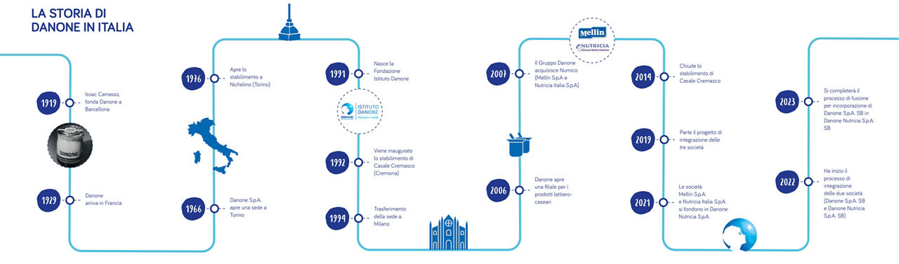 In Italia l’attività di Danone abbraccia un’ampia varietà di categorie: dai prodotti lattiero-caseari, a quelli a base vegetale, dai latti formulati per la prima infanzia e alimenti specifici per lo svezzamento, fino a soluzioni nutrizionali innovative per la gestione clinica di pazienti in età pediatrica e adulta (quali ad esempio l’ambito metabolico, oncologia, malnutrizione, disfagia, sarcopenia, declino cognitivo, etc). Basata sulla forte convinzione che la salute delle persone e delle comunità e quella del pianeta siano fortemente interconnesse, il Gruppo ha lavorato al Danone Impact Journey, un percorso che è un vero e proprio piano d’azione per estendere il proprio contributo in modo concreto a tutti gli ambiti della sostenibilità.
