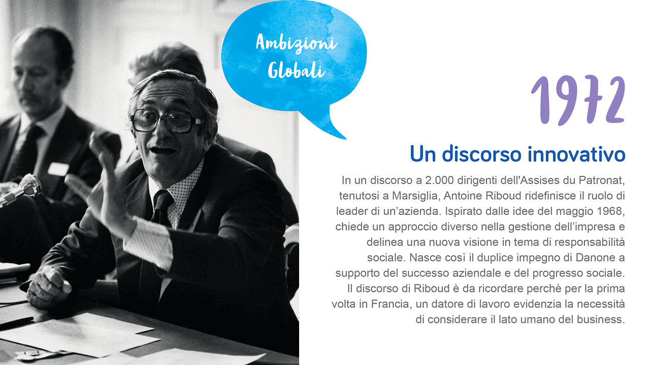 In un famoso discorso del 1972, il co-fondatore e poi CEO di Danone, Antoine Riboud, ha dato il via al duplice progetto di Danone per il successo aziendale e il progresso sociale.