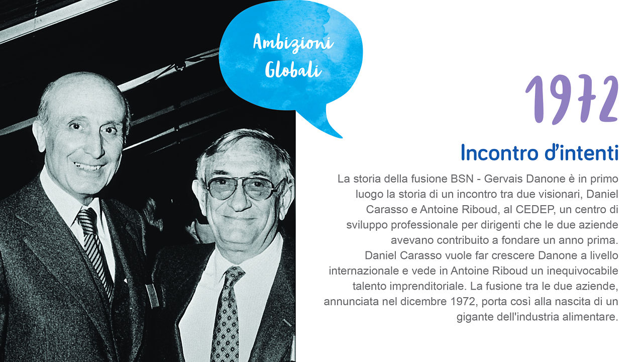 Spesso nella vita le cose più belle succedono per caso. E quasi per caso è nata Danone, da una fusione tra BSN e Gervais Danone e dall’incontro quasi casuale tra Daniel Carasso e Antoine Riboud.