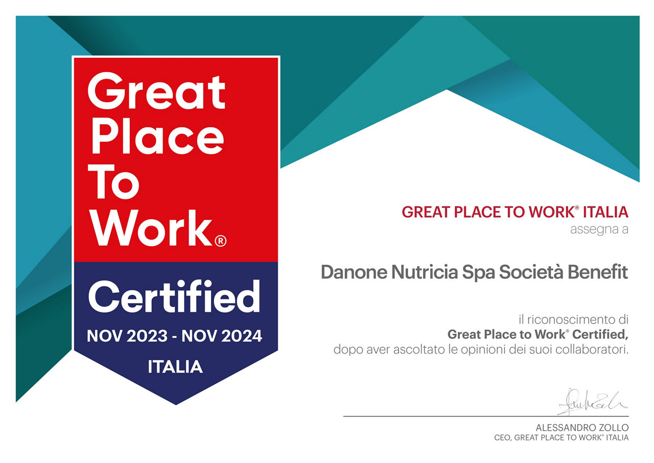 Danone Nutricia Spa Società Benefit si riconferma, anche nel 2023-2024 un Great Place to Work per l’impegno a promuovere il benessere delle nostre persone negli ambienti di lavoro.