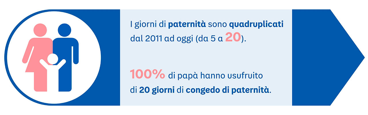 Anche al papà vengono garantiti i 20 giorni di paternità retribuita, per consentirgli di condividere i primi momenti di vita del neonato.
